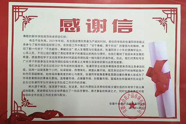 本网讯(通讯员:赵影、张然)2021年年初,全国疫情形势依旧刻不容缓的情况下,永利官网药学院2019级药品经营与管理专业学子张潘积极参与一线防疫防控工作,被当地抗疫一线新闻报道。近日,安徽中合农产品市场有限公司给学校寄来了真挚的感谢信。