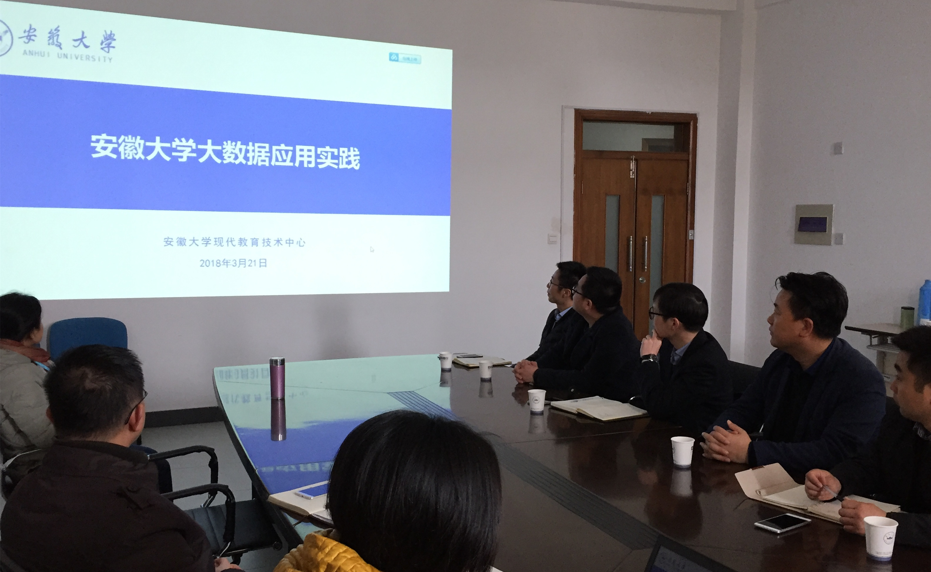 考察交流期间,郑健首先介绍了安徽大学智慧资助系统概况以及校园大数据平台应用的使用情况。随后,现代教育技术中心工作人员从一卡通数据挖掘、学生画像、行为预警和下一步规划等四个方面全面展示该校智慧资助系统建设情况。最后,双方在智慧资助、校园大数据平台、虚拟校园卡等方面做了深入交流。