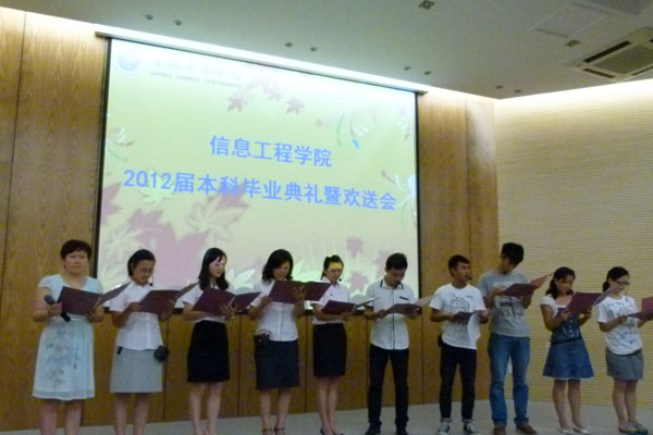 与以往不同,在本科毕业典礼结束后,信息工程学院的毕业生代表带来了歌曲串烧,在《睡在我上铺的兄弟》、《那些花儿》、《再见》、《同桌的你》、《祝你一路顺风》的歌声中,在场同学共同回忆了大学四年生活的点滴。2008级信息与计算科学专业的同学穿上印有每位同学笑脸的文化衫共同唱起了经过改编的歌曲《老师,我爱你》,当同学们唱到“老师我爱你,我们即将分离。信工院的孩子还要你教育。老师我爱你,你一定要注意身体,祝福你们永远年轻。”时,感动了在场的所有老师。最后,师生共同朗诵《忆往昔,彼四年,在明天》,在一句“再见,再会,让我们相聚在下一个明天”中,将欢送会推向高潮,毕业生代表向老师送上鲜花,掌声中画上圆满的句号。