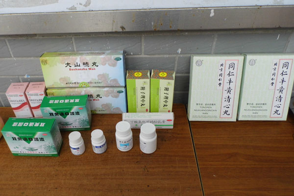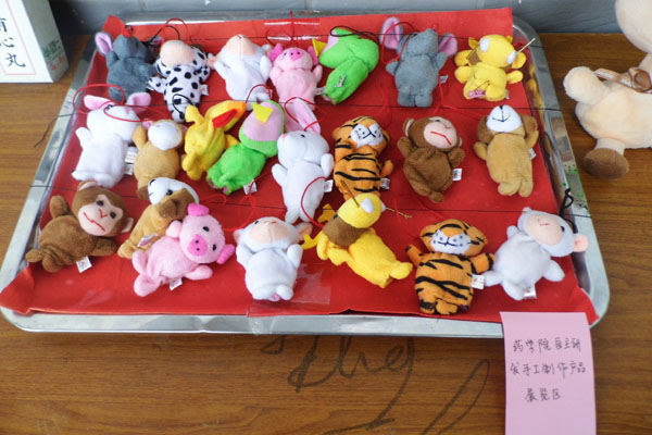 药学院的一顶帐篷内,桌子上摆放着各种各样的避暑药品,装有草药的凉枕以及学生自制卡通香嚢。不少家长驻足在摆放香囊的桌子前观看。