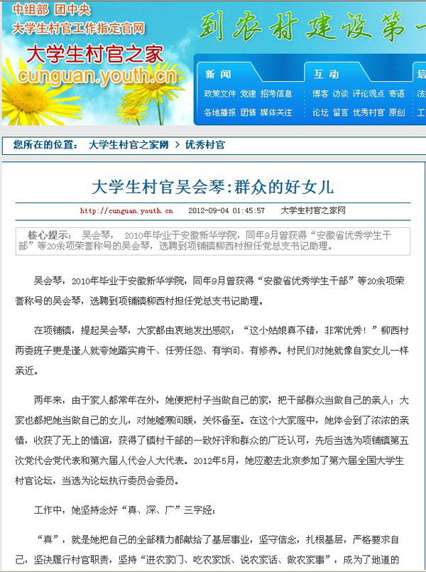 大学生村官之家网讯(通讯员 祝静静)近日,中国青年网下属网站大学生村之家官网一篇题为《大学生村官吴会琴:群众的好女儿》的新闻,报道了永利官网优秀毕业生吴会琴在大学生村官工作中的先进事迹。
