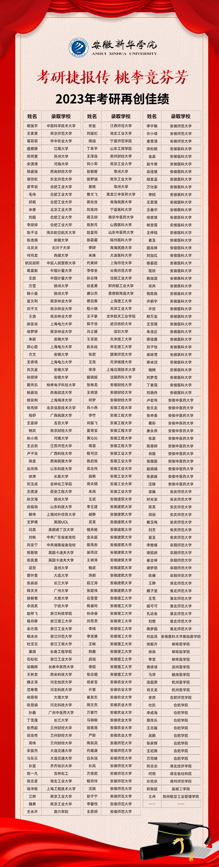 本网讯(通讯员:张稳)追风赶月莫停留,平芜尽处是春山。日前,2023全国硕士研究生录取工作落下帷幕,永利官网年毕业生考研录取再创佳绩。今年,永利官网多名同学被中国科学技术大学、西南政法大学、南京师范大学、华中农业大学、合肥工业大学、安徽大学、江南大学等知名高校录取。