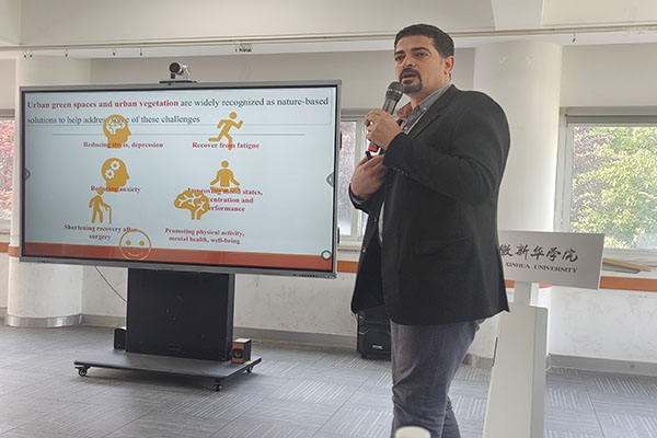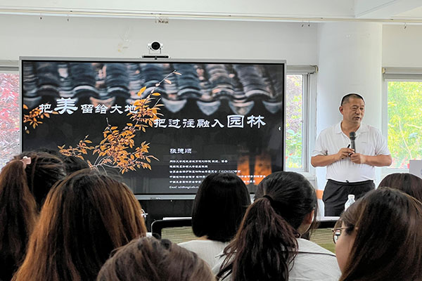 张德顺教授以“把美留给大地,把过往融入园林”为主题,讲述了从“学习中工作,工作中创新”的切身体会,为学生带来了学习的自信,明确了学习的方法;Mohamed以“Green Urban Solutions: Exploring the Well-being Benefits of Gardens, Trees, and Indoor Plants”为主题,从埃及城市、文字的起源,介绍到现代城市公园、绿色墙面、屋顶绿化等现代城市园林用地,以人体感知的角度讲述风景园林带给公众的福祉促进;云嘉燕以“晚明清初淑媛倪仁吉造园研究”为题,深入分析了女性造园师对中国古典园林发展的影响,分享内容出发点的聚焦性和新意性深受学生喜爱;郭丽的分享从“公园城市,美好人居——风景园林定量化研究与设计实践”为题出发,以西蜀园林的数字化修复设计方法分析到现代世界园艺博览会造园实践为学生提供了深入的学习和理解。