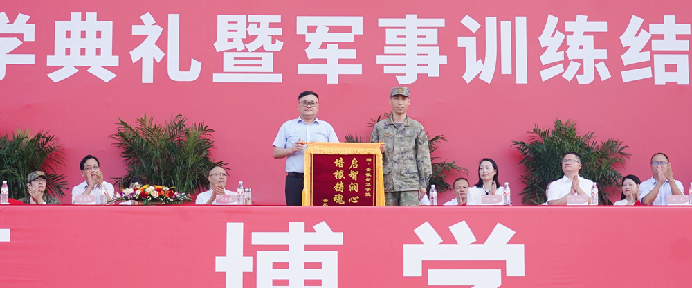 常务副校长王丽为获评军训工作“内务标兵单位”“训练标兵单位”的代表颁奖。