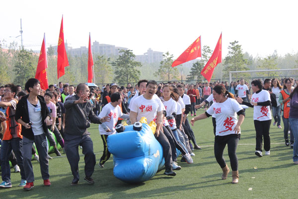 从运动会开始到结束,参赛的每一个运动员每一个团队都牵动着在场员工的心弦。同呼吸,共命运。彼此加油、欢呼、喝彩。现场欢声笑语此起彼伏。虫虫总动员拉开了运动会的的帷幕,各代表队一听到口哨声咬紧牙关奋力向前,队员们一个个面红耳赤,争相以最快的速度冲向终点,谁也不让谁。接下来的袋鼠搬家和无轨列车再次活跃了现场气氛,运动员们的体力尽管消耗了大半,依旧满怀激情地将比赛进行到底,赛道边上的呐喊声与敲锣打鼓声交织在一起。之后,众星捧月、鸿运通途、扎辫子和绑腿跑依旧有秩序地进行着,运动会也渐渐接近了尾声。