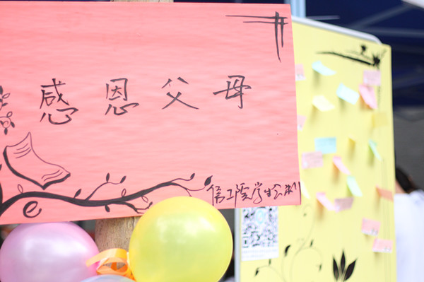 信息工程学院门前的接待处旁放了很多卡通 KT板,上面满是鼓励新生和感恩父母的温情语句,字字句句都是情真意切;签名墙前新生纷纷签名,并与学长学姐合影留念,记录自己大学生活的起点。