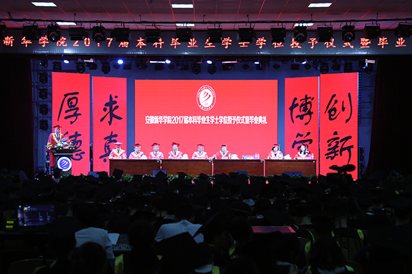 新华集团常务副总裁、学校董事长陆真,新华集团副总裁、学校董事黄源,省督导专员、学校党委书记储国定,校长石秀和,副校长杨世国、王可、李金星、王丽,校长助理朱兆健与毕业生代表一一握手,为他们颁发学士学位证书、扶正流苏,祝贺他们顺利完成大学四年的学业。