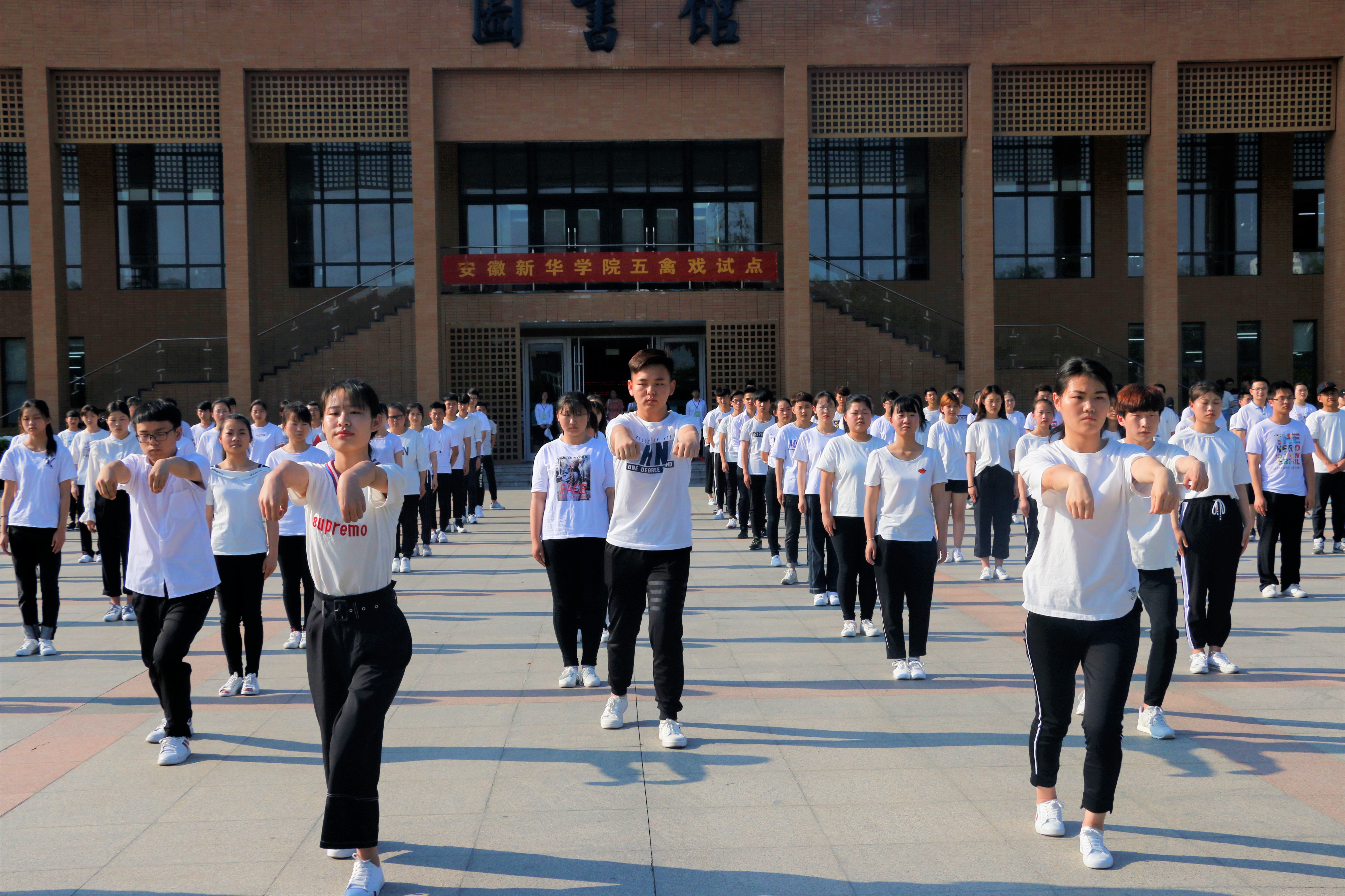 首先,由部分优秀学员展示五禽戏的典型动作,全体学员开始整套五禽戏汇报表演。在缓慢的音乐中学生们舒展身体,展现娴熟的动作,行云流水,虎举、虎扑、鹿抵、鹿奔、熊晃、猿提、猿摘、鸟伸、鸟飞等动作惟妙惟肖,动静结合、刚柔并济,展现了五禽戏的魅力。