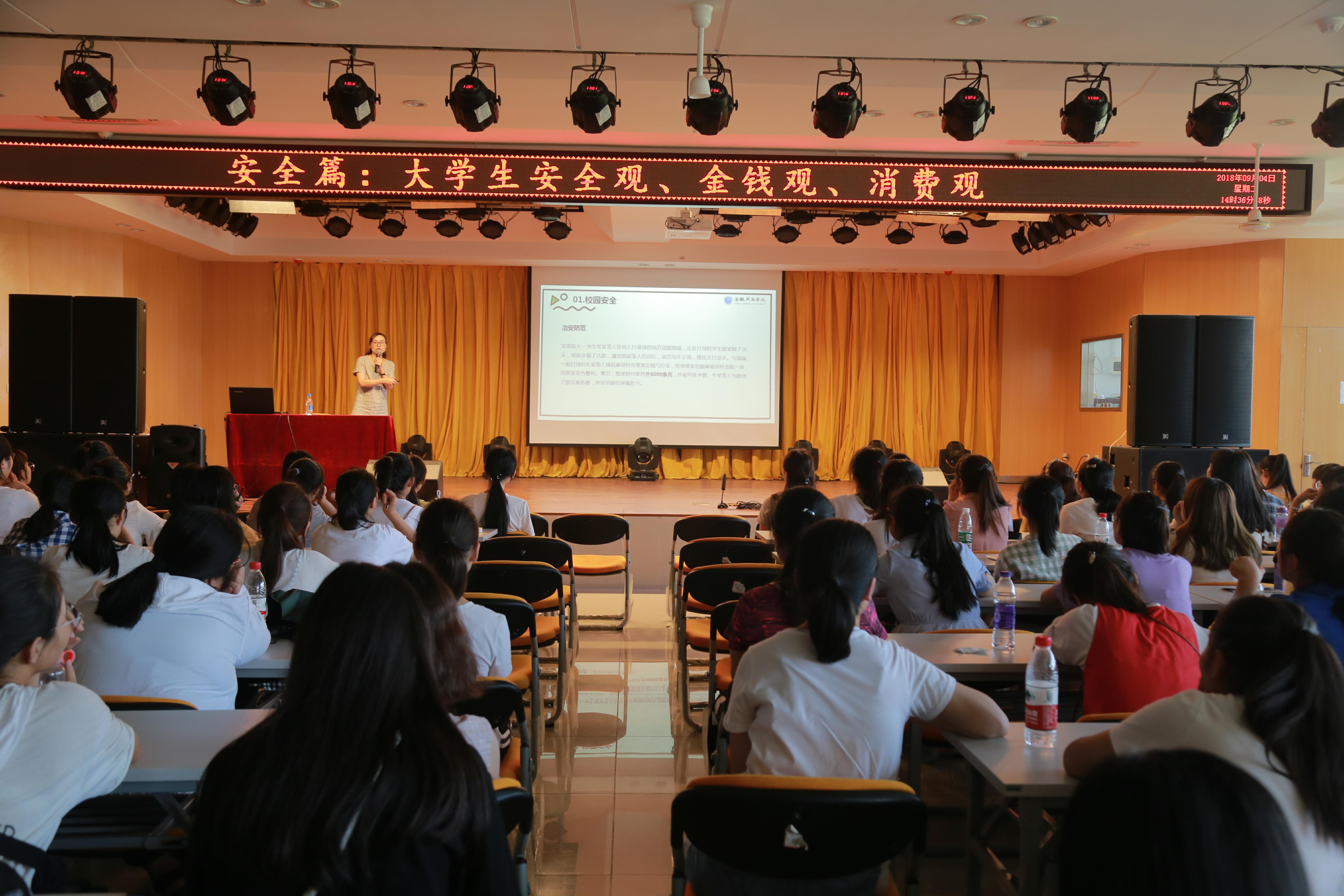 辅导员李靖为全体新生分享大学生安全教育课程,她从人身安全、财产安全、消费安全等方面详细介绍大学生可能面对的安全问题,建议新生无论是在校外还是校内都要注意人身安全,在外兼职或在网上购物时要注意财产安全,合理消费、理性消费并健康成长。她运用丰富的案例说明校园贷的危害,并告诫学生们对待校园贷要做到“四防”:认清网贷风险、防范不良网贷、引导理性消费、营造舆论氛围。