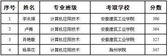 信息工程学院 2012届学生在今年专升本考试中取得较好成绩,比去年录取总人数增加了11名同学,其中12号楼222宿舍2009级计算机应用技术专业4名同学报考均被录取,2009级计算机网络专业2名学生分别以总分第一名、第二名的好成绩被滁州学院录取。