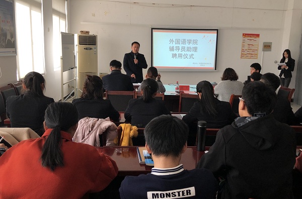 本网讯(通讯员:万媛媛)为了加强学生的自我教育、自我管理、自我服务的意识,促进学生工作的规范化、制度化、科学化,外国语学院于11月26日中午举办辅导员助理聘用仪式。外国语学院副院长杨光、相关教师代表以及学生代表参与此次聘用仪式。