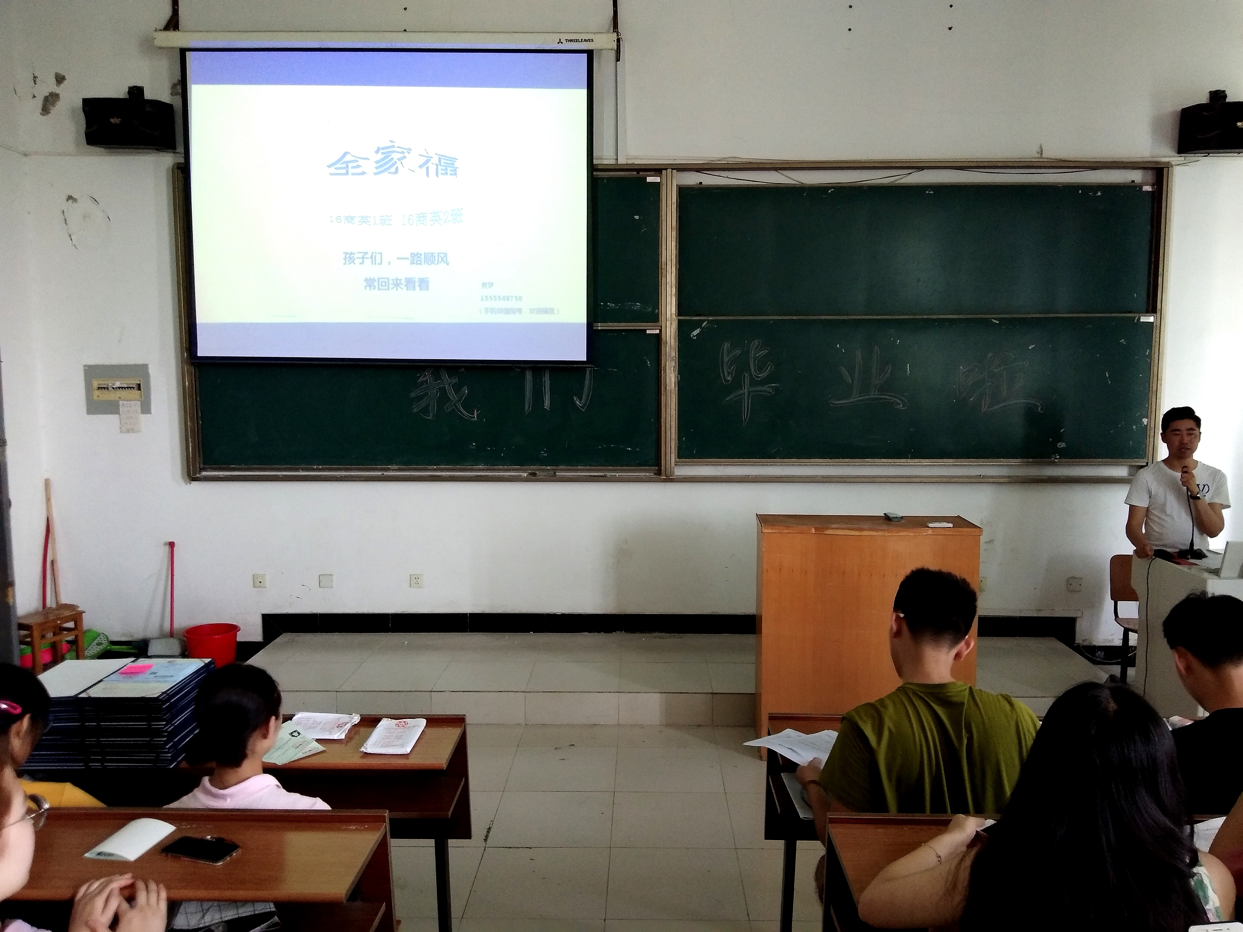 6月5日是毕业生最后一次班会,辅导员黄梦以PPT的形式首先讲述了“华园初遇”,表示在第一次班会上同学们充满了对大学生活的好奇与向往,而对于身为辅导员的自己更多的是紧张。而后的“华园相知、相伴、相惜”,也用图片诠释了大学生活是如何从安全教育开始的、又如何从简历的指导结束的,最后用“全家福”的字样结束了此次班会,与毕业生们进行告别,大家纷纷对辅导员道出了不舍,对母校表达了感恩。