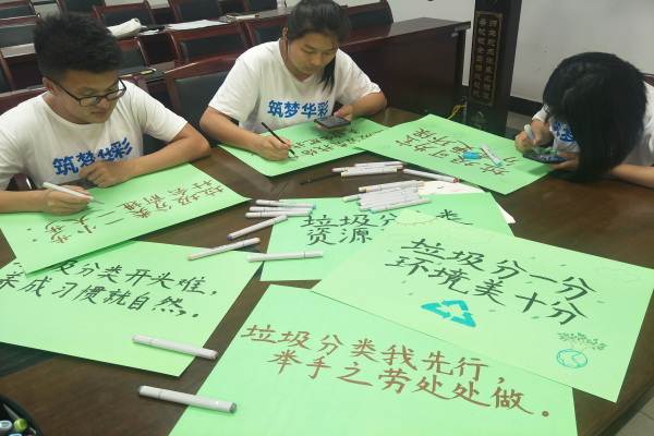 上午,筑梦华彩社会实践队队员们齐心协力动手制作关于垃圾分类的宣传标语,走进蜀南庭院,宣传垃圾分类。下午,实践队的队员们徒步前往学校附近的蜀南庭苑,从垃圾产生的源头到垃圾处理的过程,对不同年龄段与不同身份的居民进行采访,询问关于日常垃圾产生、分类、投放等具体问题。居民积极配合,热情接受采访。