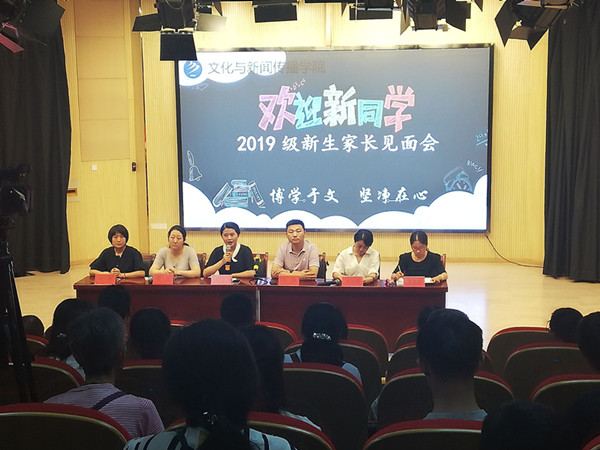 洪玉从学院的专业设置、师资力量、实验室建设以及人才培养质量等方面,介绍了文化与新闻传播学院的发展和专业特色,各系主任分别介绍了艺术表演系、新闻系、中文系的学生培养方案、专业师资力量和学科竞赛成果。朱向群从新生要学会自我管理、自我学习、自我约束、自我提升四个方面提醒家长大学生要以学习为主,每个阶段要有不同的目标,还提醒家长监督新生远离网络刷单诈骗、校园贷、网贷等,注意学生个人安全。