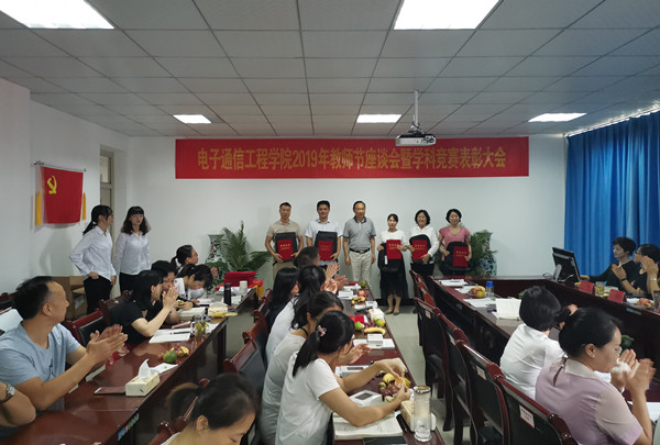 9月4日电子通信工程学院举办了2019年教师节座谈会暨学科竞赛表彰大会。全体教师欢聚一堂,分享学科与科技竞赛指导经验与感悟。副校长杨世国、执行院长王琦进,副院长舒敬荣、柯姗姗,院长助理李长凯以及全体教职员工参加了座谈会。会议由王琦进主持。