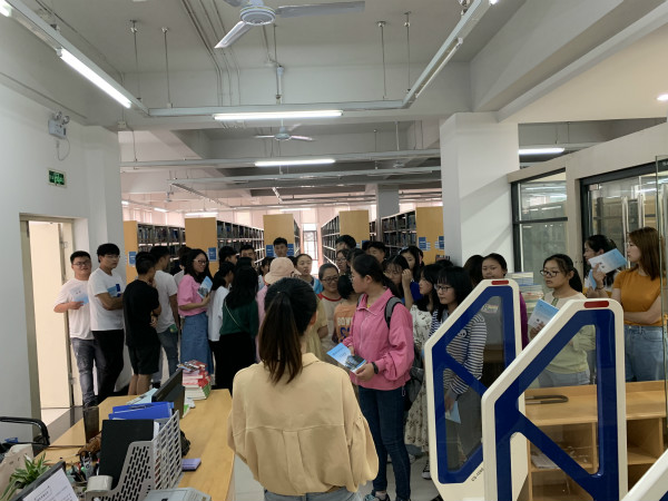 培训过程中,老师和优秀志愿者们首先对各位新生来到美丽的华园表示了热烈欢迎并祝愿他们在接下来的学习、生活都万事顺意。随后培训正式开始,讲解员们分别对图书馆的大体概况、馆藏资源、开放时间、自习室以及移动图书馆的使用、馆藏检索机等分别进行了说明;强调了门禁、借还书籍和存包柜使用时的注意事项。为了让学生更清楚地知道如何借还书以及需要注意的问题,讲解员们根据各学院新生专业的不同,带领新生参观各自专业的图书所在馆藏位置,将整个借还书流程和需要注意的事项细致耐心地讲解给学生。