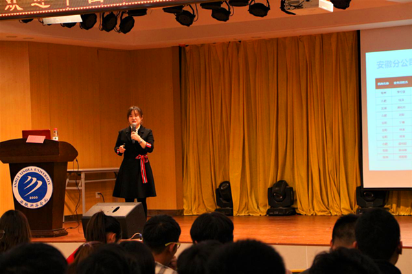 会上,程祝兰主要从保险的理赔、保险行业的发展现状和保险的就业前景三个方面结合具体的案例进行了深入浅出的讲解,并重点补充了保险行业就业需具备的基本职业素养。她指出保险的核心在于风险分摊,保险的本质是互助,是用来降低人们日常生活中出现风险后造成的经济损失;她认为保险业属于朝阳行业,有强大的社会需求,未来三年合肥的保险从业缺口7万人,鼓励学生们在校期间多储备保险学相关理论知识的实践经验。最后,程祝兰结合自身的工作经历就保险公司的岗位职责、行业技能要求、职业选择等方面对在座的各位同学进行了有针对性的规划和建议,并与现场教师和学生提出的具体问题进行了深入交流和探讨。