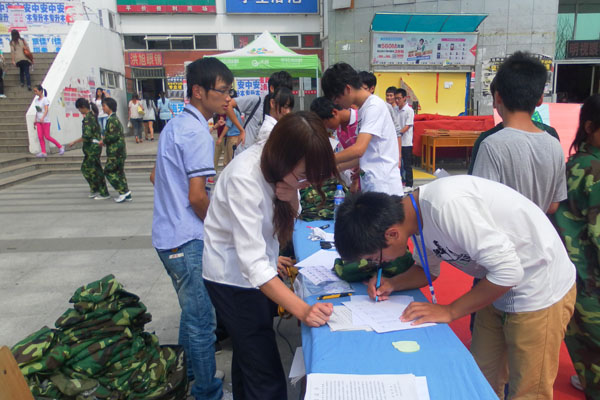 活动刚开始,就有不少大一新生驻足观看,他们衣着绿色迷彩服,排队登记个人信息,等待着将自己的军训服募捐出去。2012级商学院会计电算化3班的何嘉丽笑着对记者说道,“军训服很有纪念意义,但一想到可爱的西部笑脸,我更愿意把这份爱心带给他们。”