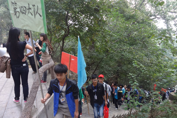 登山期间,还设置了一些互动节目。第一大队准备了“共享蜀山碧水蓝天,争做时尚绿色先锋”的横幅在登山的过程中邀请游客签名并向其宣传环保观念。同时志愿者在通往大蜀山的路途中设置“关卡”等待各个登山小队到来“对答环保问题”,题目都是有关环保方面的,答对了就可以顺利的向大蜀山迈进,如果答错了大队中就必须表演一个节目方可通行。还有那有趣的“盲行”,男女合作,先将男生眼睛蒙上,让女生搀扶男生行走;再让男生和女生交换角色,增加大家之间的信任度加强协会内部与外部的合作与交流。素质拓展期间开展了许多有意思的活动,有小组特别展示、缩小包围圈游戏、拯救行动游戏、抢收抢种、万里长城永不倒。名人湖草坪闪烁着一群志愿者的欢快身影,他们的脸上洋溢着笑容。通过这些活动希望同学们在游戏的过程中关注环保,体会快乐。志愿者们在登山过程中,通过语言宣讲、口号、游戏、环保行等方式,向来大蜀山游玩的游客以及周边居民宣传环保理念和知识,让游客和居民在游玩中关注环保,在环保实践中体会快乐。行动更好地保护、美化蜀山的自然风景!清除山上的垃圾,还大蜀山一个美丽的容貌。通过登山,来释放工作、学习的压力,调节人的身体和心理平衡,有益于登山者的身心健康。素质拓展 是以培养合作意识与进取精神为宗旨,崇尚自然与环保,增强团队活力、创造力和凝聚力,达成提升团队生产力的目的。
