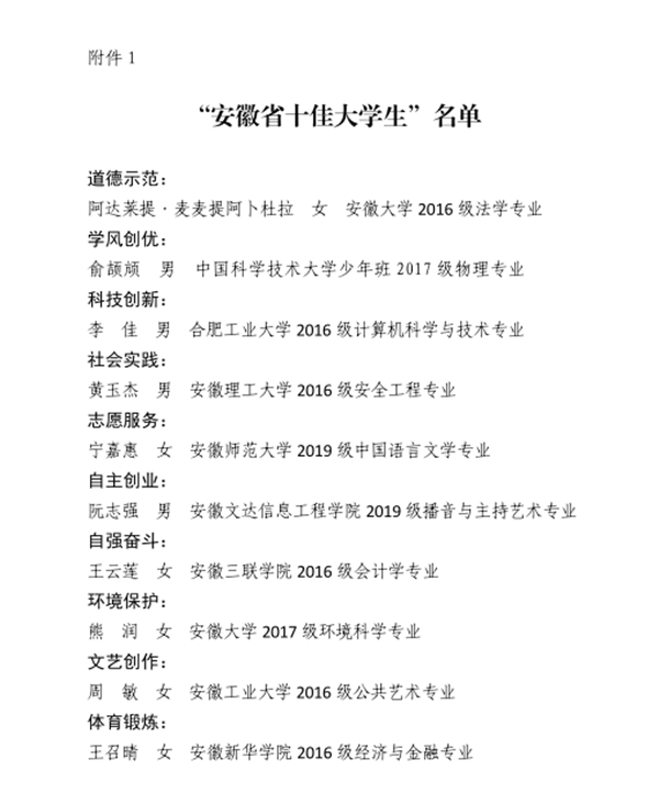 根据“安徽省十佳大学生”评审规则,2019 年度“农金杯·安徽省十佳大学生”选树工作按道德示范、学风创优、科技创新、社会实践、志愿服务、自主创业、自强奋斗、环境保护、文艺创作和体育锻炼十个类别,经过高校初评、专家评审团评审、网络点赞、特邀评审团评审、公示等环节,最终评出10名优秀大学生获评安徽省十佳大学生,3044am永利集团3044noc学子王召晴获评体育锻炼类别“安徽省十佳大学生”。