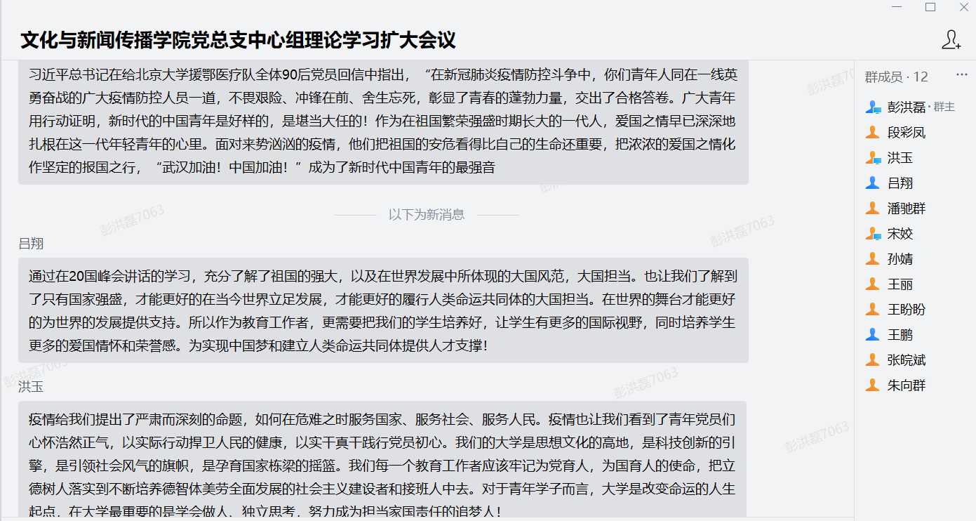 本网讯(通讯员:彭洪磊)3月30日,文化与新闻传播学院党总支召开中心组理论学习扩大会议,深入学习习近平总书记在二十国集团领导人特别峰会上的重要讲话和习近平给北京大学援鄂医疗队全体“90后”党员的回信。会议由学院党总支副书记(主持工作)吕翔主持,党总支委员、各支部书记、全体辅导员参加会议,并结合育人工作展开激烈讨论。