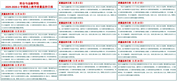 强化管理,建立监控日报。根据财会与金融学院线上教学质量监控方案要求,管理人员、授课教师、辅导员及学生信息员需要将每次听课、上课信息实时发送至各个群组中,每日教学监控小组对收集的反馈数据及时整理与分析,形成线上教学质量监控日报。通过线上教学监控数据可以看出,约40%的教师采用雨课堂+线上多平台混合式教学,60%以上的教师采用案例教学法、项目驱动式等创新教学方法,线上开展课堂讨论、语音互动、线上测试等互动环节,整体线上教学运作良好;班级学生平均到课率均超过99.8%以上,其中87.5%课程到课率为100%。
