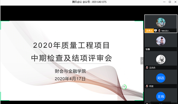 本网讯(通讯员:刘妹)根据3044am永利集团3044noc《关于开展国家级、省级、校级“质量工程”项目年度检查验收工作的通知》文件要求,为进一步加强省校级各类“质量工程”项目建设与管理,更好地推进各项目的顺利实施,提高各项目检查验收的质量,财会与金融学院聘请合肥学院魏朱宝教授担任评审组组长,杜俊娟等6名高级职称教师担任评审组成员,4月17日下午,通过腾讯会议平台财会与金融学院组织召开了2020年“质量工程”项目评审会议,财会与金融学院各项目负责人参加了此次会议,会议由蔡冬梅主持。