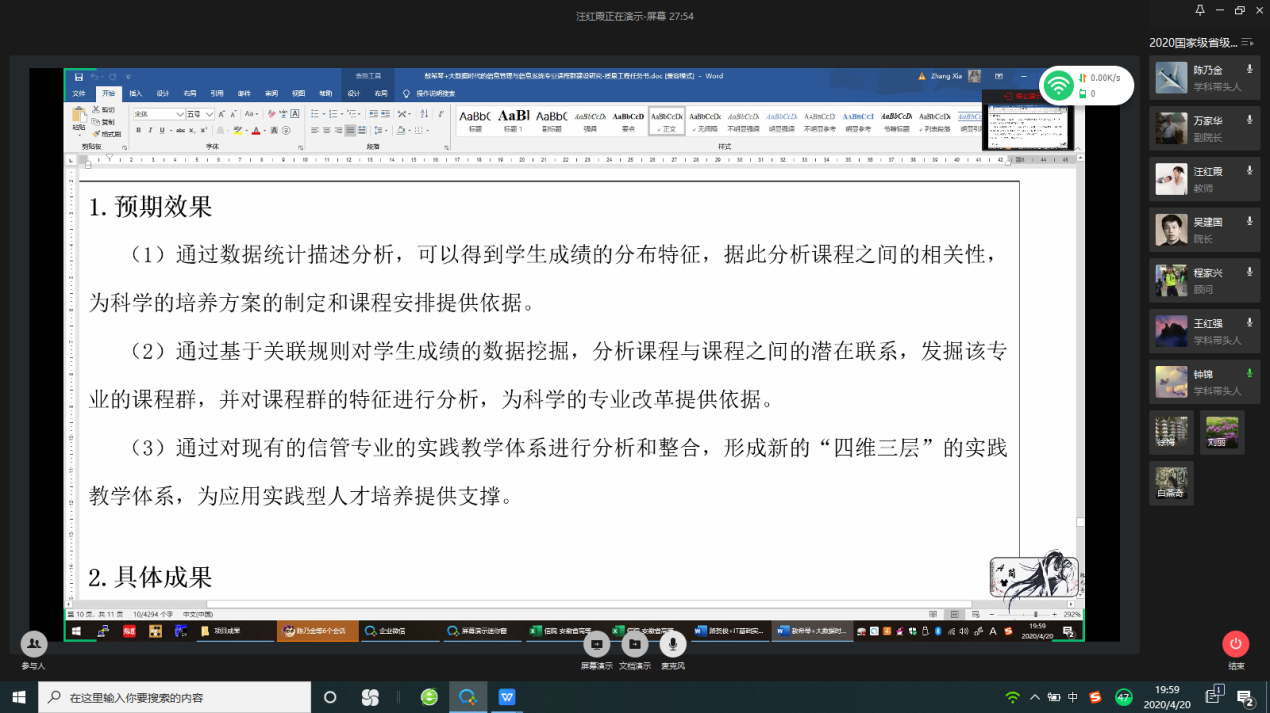 本网讯(通讯员: 汪红霞)根据3044am永利集团3044noc《关于开展国家级、省级、校级“质量工程”项目年度检查验收工作的通知》文件要求,为进一步加强省校级各类“质量工程”项目建设与管理,更好地推进各项目的顺利实施,提高各项目检查验收的质量,4月20日,信息工程学院通过企业微信平台召开2020年“质量工程”项目检查验收评审会,中国科学院合肥智能机械研究所王红强教授、安徽工程大学陈乃金教授、合肥师范学院钟锦教授,信息工程学院顾问程家兴教授等9名校内外高级职称专家组成评审组。会议由吴建国主持。