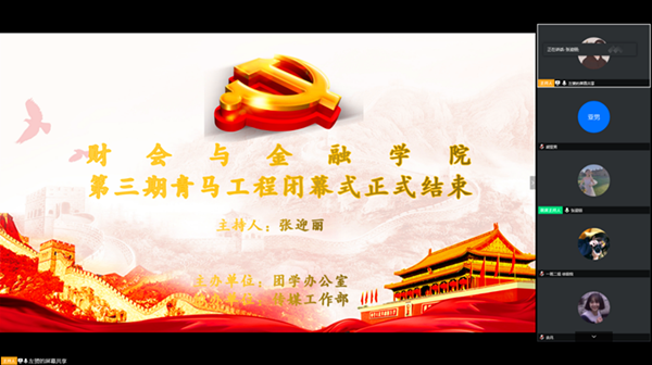 本网讯(通讯员:何倍)4月22日,“共赴‘云’青马,携手‘疫’青春”——财会与金融学院第三期青马工程结业典礼通过线上平台顺利举行。财会与金融学院团总支书记何倍、组织委员谷学颖、心理辅导员李梦、学生骨干代表及全体青马工程培训班成员参与本次典礼。