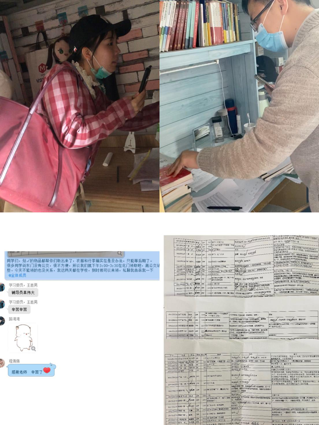 在文化与新闻传播学院党总支副书记朱向群的带领下,各辅导员开启线上云办公,建立“在线咨询志愿服务”,并发动学生党员加入“在线咨询志愿服务”队伍,通过在线活动,统计学生急需物资。辅导员彭洪磊、孙婧、王盼盼、王丽,张皖斌等人深入学生宿舍,在征得学生的同意后,通过在线视频方式,寻找学生急需物资并进行整理邮寄,为学生送去贴心的关怀和温暖。