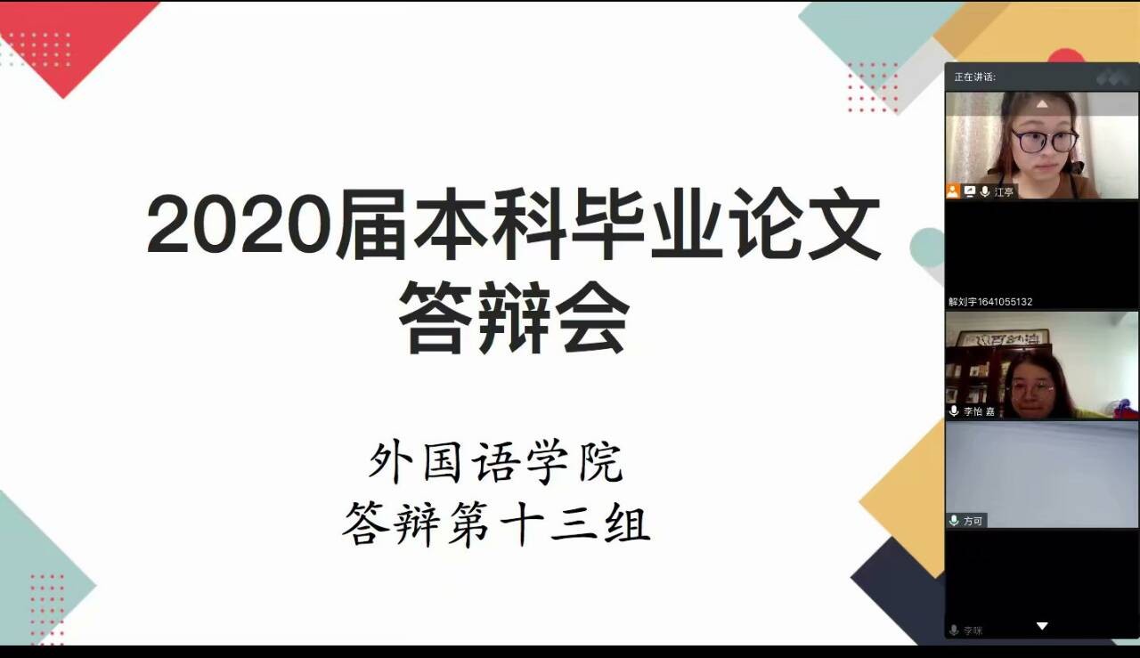 本网讯(通讯员:姜亚琴)为认真贯彻落实教育部《关于从严加强高校疫情防控工作的通知》,同时确保疫情防控期间毕业生可按其顺利毕业,外国语学院于5月16日开展了2020届本科毕业论文线上答辩工作。外国语学院全体教师、英语专业(包含英语辅修专业)、商务英语专业以及日语专业(包含日语辅修专业)300名本科毕业生参加了此次答辩。