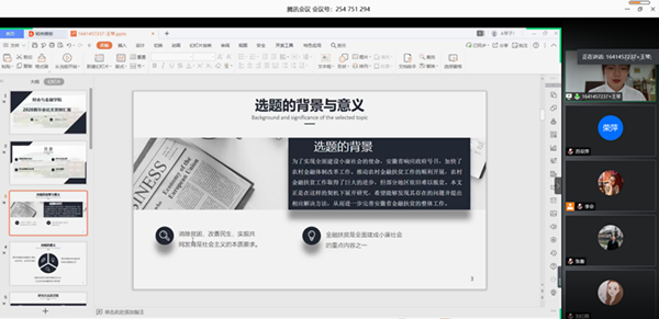 疫情防控期间,财会与金融学院非常重视线上答辩工作,为保证本次特殊形式答辩的顺利进行,于5月13日下午专门召开线上工作会议,就疫情形势下做好本科毕业论文(设计)答辩工作进行部署。会上,明确“标准不放松、要求不降低、质量不打折”的基本原则,制定了《财会与金融学院2020届本科毕业论文线上答辩工作方案》,为线上答辩提供操作指引,要求答辩要求和流程与线下答辩完全保持一致,确保答辩公开、公平、公正。要求各系和各专业加强对毕业论文的线上指导,对因受疫情影响完成毕业论文有困难的学生,要加强对其辅导帮扶与心理引导,全力保障学生顺利完成毕业论文,并按时毕业。