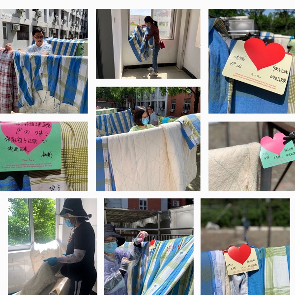 期间,辅导员化身辛勤的“园丁”,在公寓管理中心的协助下,分组进入学生寝室打扫消毒,开窗通风,帮学生晾晒被子,为了让晒完的被褥准确无误地放还寝室,辅导员们在晾晒前为每一床被子贴上了专属“爱心标签”。烈日下,他们你来我往,满头大汗,“被子已晒,欢迎返校”简短几字蕴含着无限的爱。