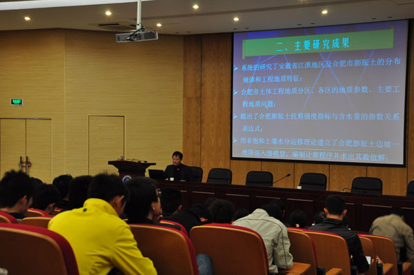本网讯(通讯员 吴韬,摄影 万士斌)为扩展土木师生在岩土工程方面的学术视野,吸引广大教职员工积极投身科研工作,提高青年教师的科研水平。11月9日下午,土木与环境工程学院在学术报告厅举行了《合肥市岩土体工程特征及地基划分》的学术报告,本次报告邀请到了合肥工业大学资环学院王国强教授主讲。学院相关专业的教师及部分土木工程专业学生近百人参加了本次学术报告。