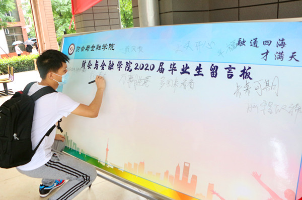 由于疫情,本次毕业生返校、离校显得有些仓促,但是财会与金融学院尽可能地为毕业生营造舒适暖心的环境氛围,现场准备了毕业生留言板,为毕业生送上“云祝福”,毕业离校现场安全有序。