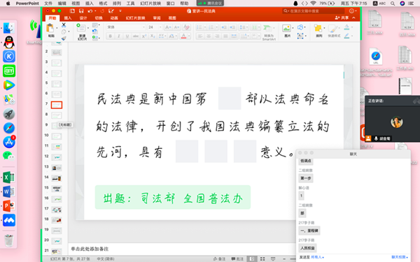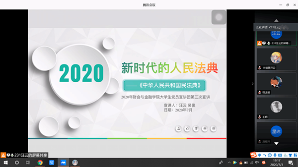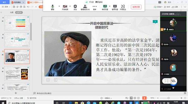 为了响应党中央的号召,积极开展民法典普法工作,让民法典走到群众身边、走进群众心里,宣讲团成员于6月17日开展线下集体备课,反复打磨宣讲PPT、精选相关视频材料,讨论宣讲技巧等,并根据各班期末考试等情况,于六月中下旬至七月初进行了线上或线下的集中宣讲,效果颇佳,反响热烈。