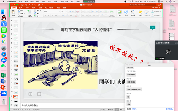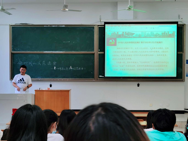 本次宣讲主要分三个方面的内容:其一,民法典的诞生在我国民法史的重大意义;其二,民法典编纂工作离不开坚强的领导核心和科学的思想指引;其三,民法典中处处体现“人民情怀”。为了增强宣讲的吸引力和感染力,宣讲团成员结合各班的班级特色,有从社会热点“扶不扶”“顶替上大学”等事例切入,有从“学习强国APP”上选取的民法典的题目导入,也有结合视频材料引入主题,既生动又丰富,极大调动同学们的参与度。