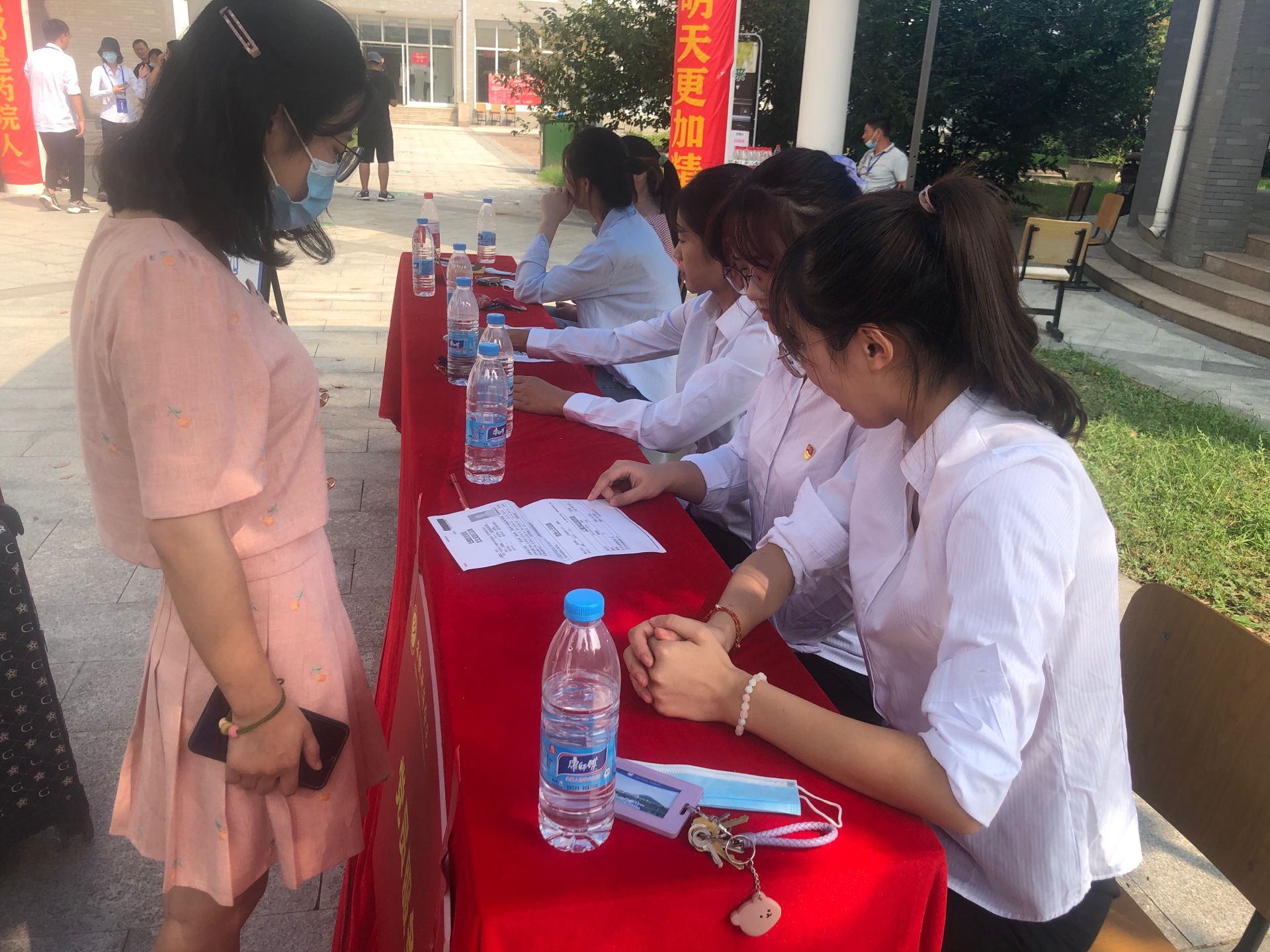 学生“党员服务台”围绕秩序维护、新生注册、服务咨询、安排住宿等几个方面积极主动开展工作,一群统一身穿白色校服、佩戴党员服务标识的身影,成为迎新现场一道靓丽的风景线。虽然迎新期间烈阳高照,天气炎热,但学生党员们依然奋斗在迎新第一线。“党员服务队”热情的接过新生和家长手中沉重的行李,主动帮助新生们完成注册,领取军训物品,以及入住宿舍等工作,让刚踏入华园的新生们感受到了不一样的温暖,让他们更快捷、更愉快地融入药学院这个大家庭。