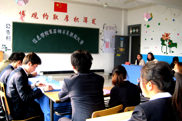 在自我介绍与展示环节,经过精心策划,辅导员们表现出了过硬的基本功和较高的综合素质。陈红老师的“金字塔管理理论”给了其他老师很多启示,苏丽老师的个人魅力也征服了在场的众多学生。新辅导员也不甘示弱,他们通过表演等形式丰富的展示了自己的特长。在班情掌握环节,评委及学生观众提问了很多学生信息,辅导员们对答如流,有的不仅能答出基本情况,还能就该生的性格特点作出说明,体现了严谨的工作态度和扎实的业务能力,赢得了阵阵掌声。随后,现场还进行了基础知识测试,采用学生监考的方式。值得一提的是,学生对参与辅导员技能比赛表示非常新鲜,这让他们了解到了辅导员老师平时不为人知的一些方面,也拉近了学生与辅导员之间的距离。