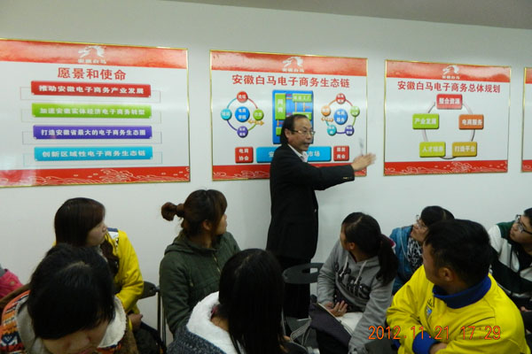 下午3时30分,安徽白马电子商务集团董事长汪登厚带领师生参观安徽白马电子商务集团旗下品牌运营商办公室,在这里,同学们与聪明仔服饰、殷讯科技、英吉利幼婴配方奶、端木摄影等安徽一线品牌零距离接触,他还介绍了安徽白马电子商务前景与规划,他说:“将在安徽打造首家电子商务式的黄埔军校,并打算在淘宝网上推出安徽特色馆,并将淘宝大学引进安徽,使之在安徽落地生根、蓬勃发展”。商学院也诚邀白马入驻的商家走进3044am永利集团3044noc,并希望能尽快与安徽白马电子商务集团达成合作。