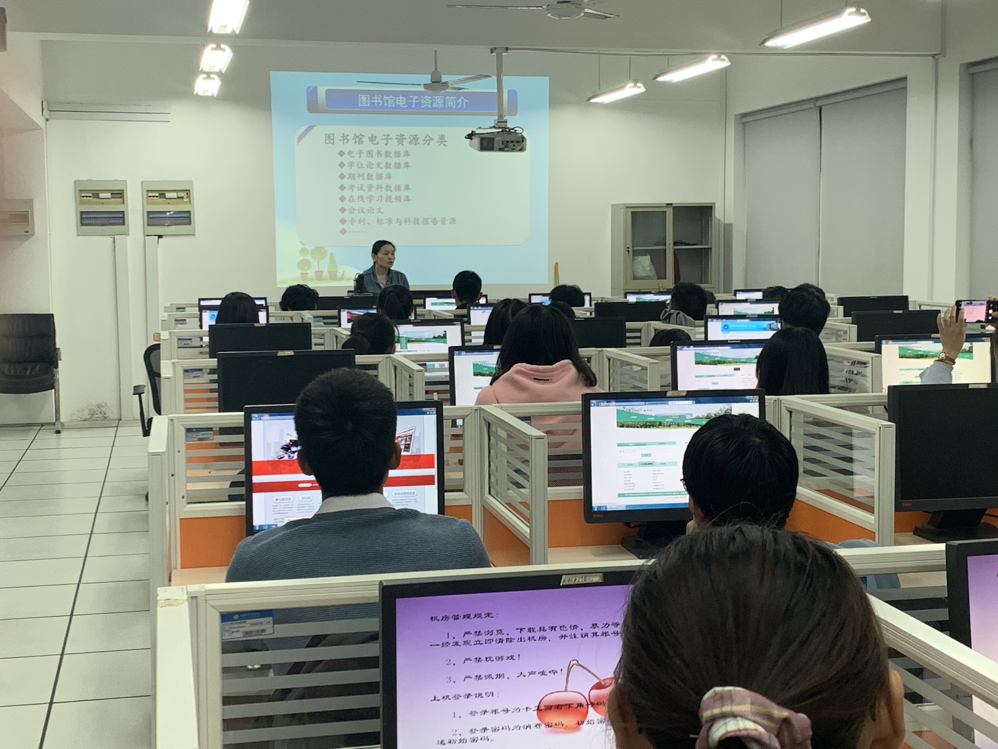 此次培训按院系进行安排,共有6场,部分场次两个院系一起进行,参与人数近200人次。在培训过程中,老师们首先对图书馆购买的电子资源进行整体介绍,随后重点介绍了几个使用率较高的数据库,如源素通、软件通、博看移动客户端、维普、万方、中国知网、银符等级考试平台等,使得各个学院的学生能够根据自己的需求有针对性地去使用各种电子资源。最后,详细介绍了中国知网数据库的使用,讲解了常见的检索方式和方法,并且让学生们通过对检索结果进行相关度排序、时间排序等方式以提高检准率。