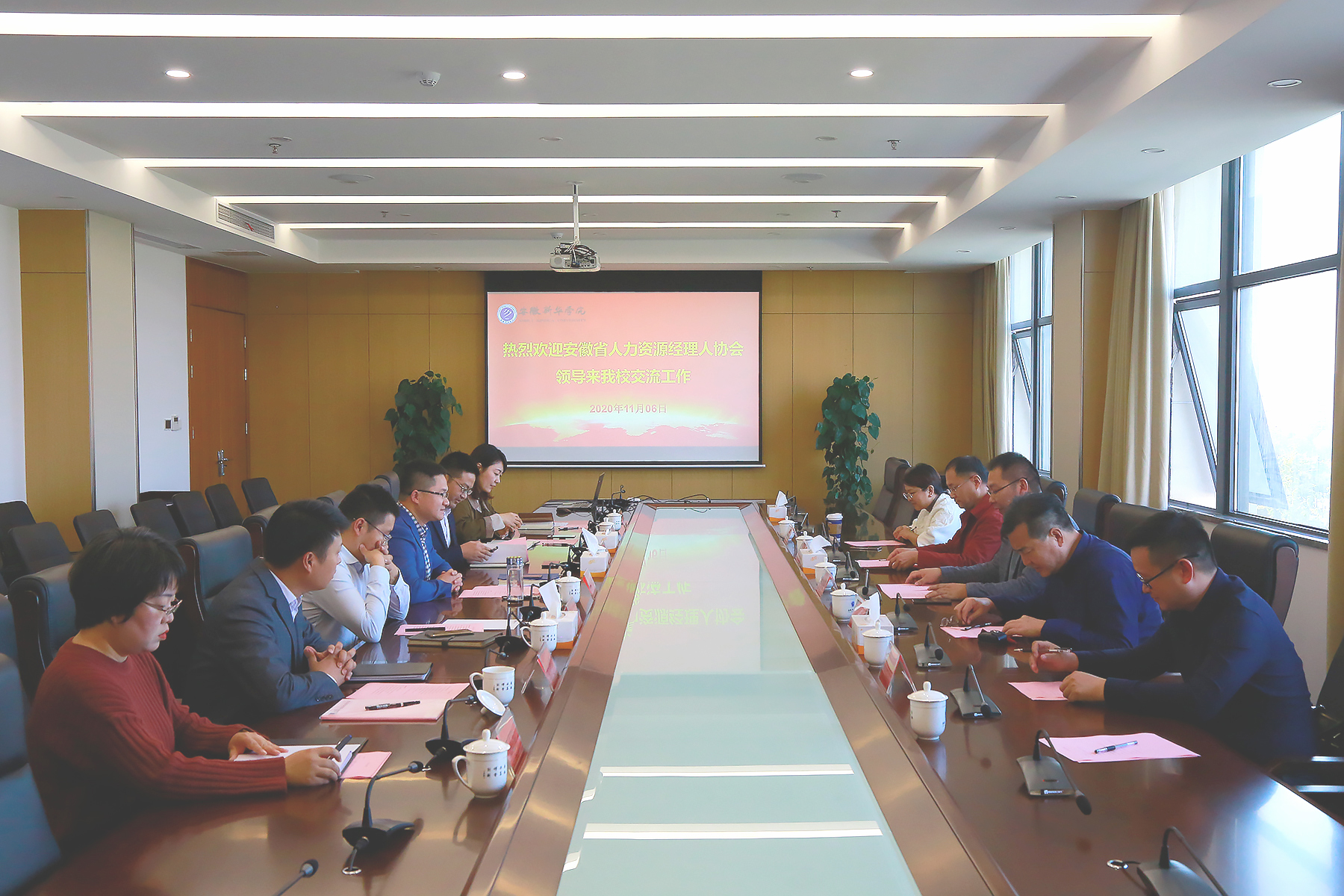 本网讯(通讯员:李彩平)11月6日下午,安徽省人力资源经理人协会会长匡龙云、常务副会长李斌、副会长田存普、秘书长吴厚君、专家委员会副主任赵会一行五人来校洽谈合作事宜。校长助理贺行佳、科技学院执行院长孙成伟及相关职能处室、二级学院代表参与接待。会议由贺行佳主持。