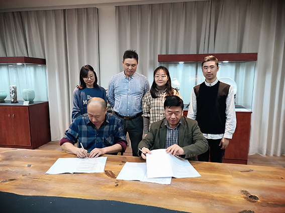 艺术学院一行受到了黄山祈韵堂文化艺术有限公司戴李平总经理的热烈欢迎。许存福向合作企业介绍了艺术学院现状、推进产学研工作的思路、加强合作的意愿及今后设想;江河在签字仪式上指出,戴李平总经理既有较高的陶艺创作水平、学术研究成果、合作交流的积极性,又有与永利官网共同推进产学研工作,协同建好实践实训基地的愿望,本次基地建立愿望的实现,将有助发挥学校和企业双方优势,协同培养社会需求的艺术人才。随后戴李平总经理与江河院长共同在协议上签字并握手互贺,双方还在在公司门前一同挂牌并合影。仪式结束后,在戴李平总经理的带领下,艺术学院一行参观了公司较具规模、高品位的工艺品展厅与正在工艺培训中的教室,并就产教融合、实习实训具体工作进行了探讨。