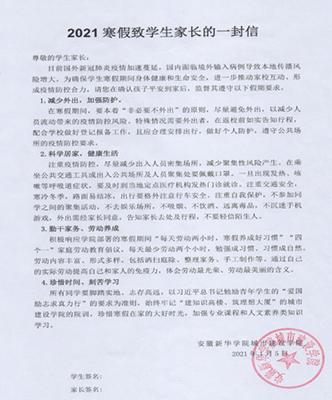 本网讯(通讯员:郑晖)为确保学生安全到家、切实推动学生劳动习惯养成,城市建设学院在给家长发放的“2021年寒假致家长的一封信中”首次加入了增强学生劳动教育理念,并配有内容详细的“四个一”假期家庭劳动教育倡议书,积极建立家校互动,倡导学生“每天劳动两小时,寒假养成好习惯”。