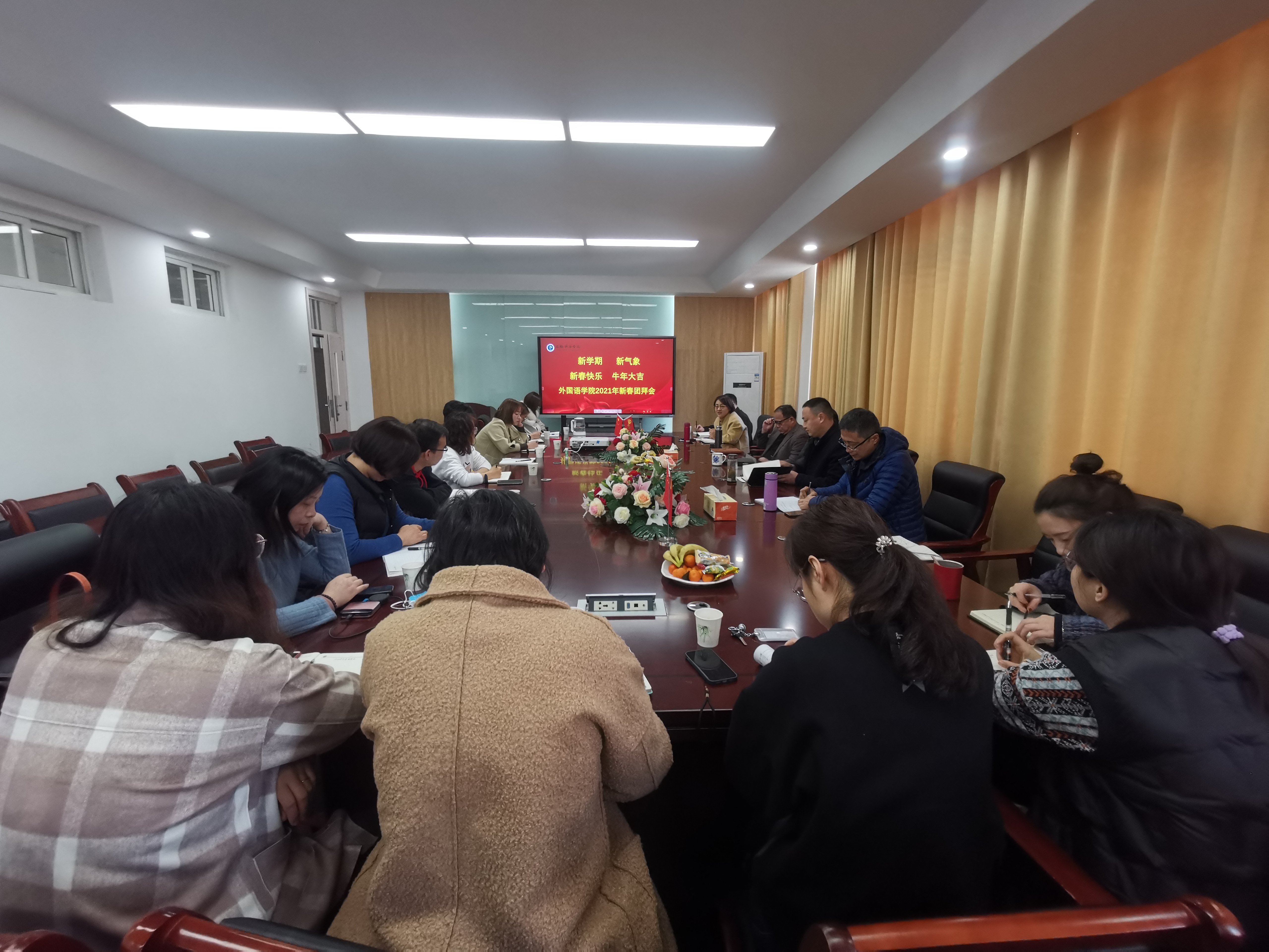 本网讯(通讯员:王婷)木铎歌盛世,金牛迎新春。2月22日上午,外国语学院2021年度新学期工作会在会议室召开,外国语学院全体管理人员及辅导员参加了会议,会议由副院长(主持工作)杨光主持。