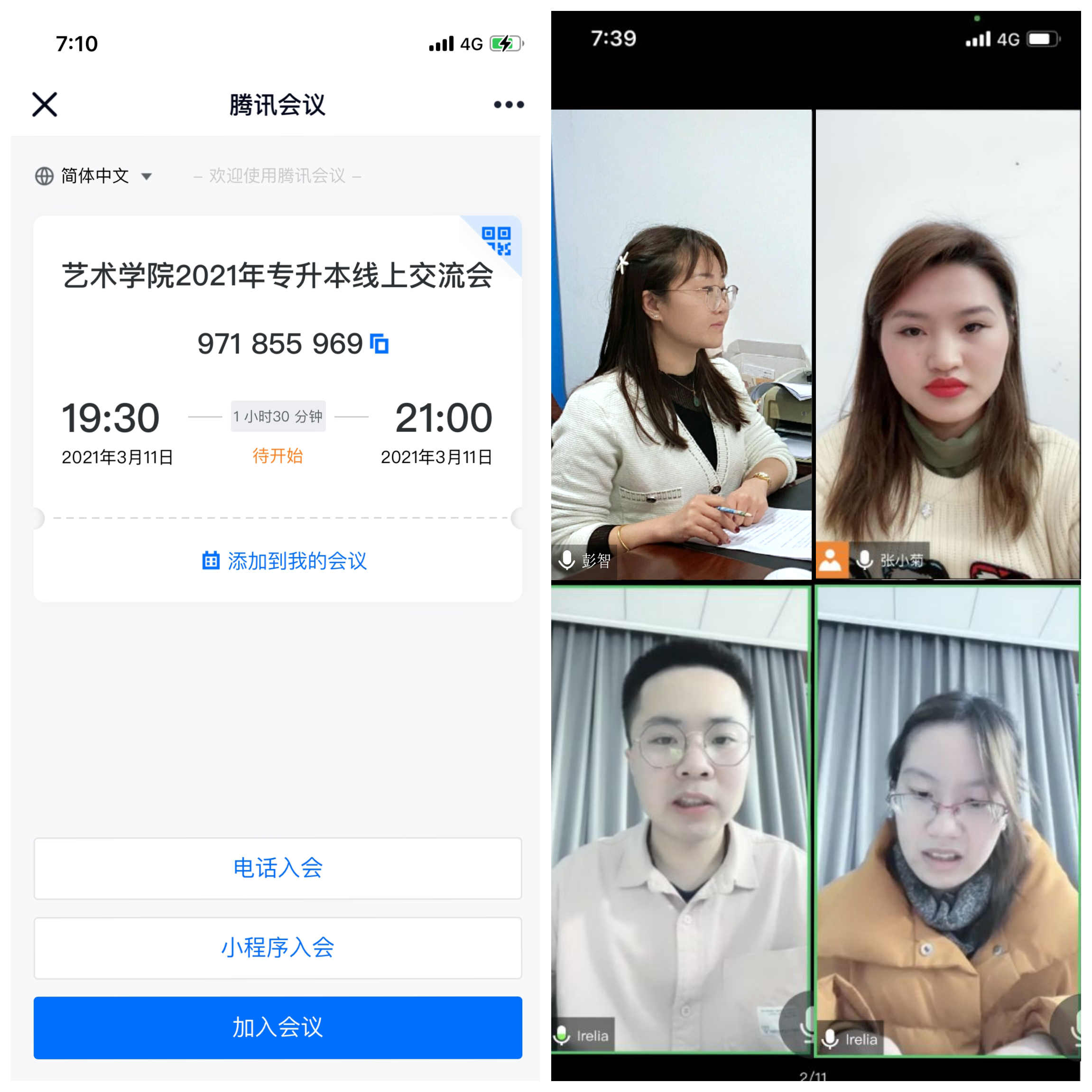 本网讯(通讯员:张小菊)为加深同学们对专升本的认识,进一步激发学习热情,增强学习动力,3月11日晚,艺术学院召开2021年专升本动员大会暨经验交流会。艺术学院院长助理彭智,专升本报名工作负责人王超,辅导员张小菊,优秀毕业生徐远、董秋雪出席本次交流会,会议由张小菊主持。
