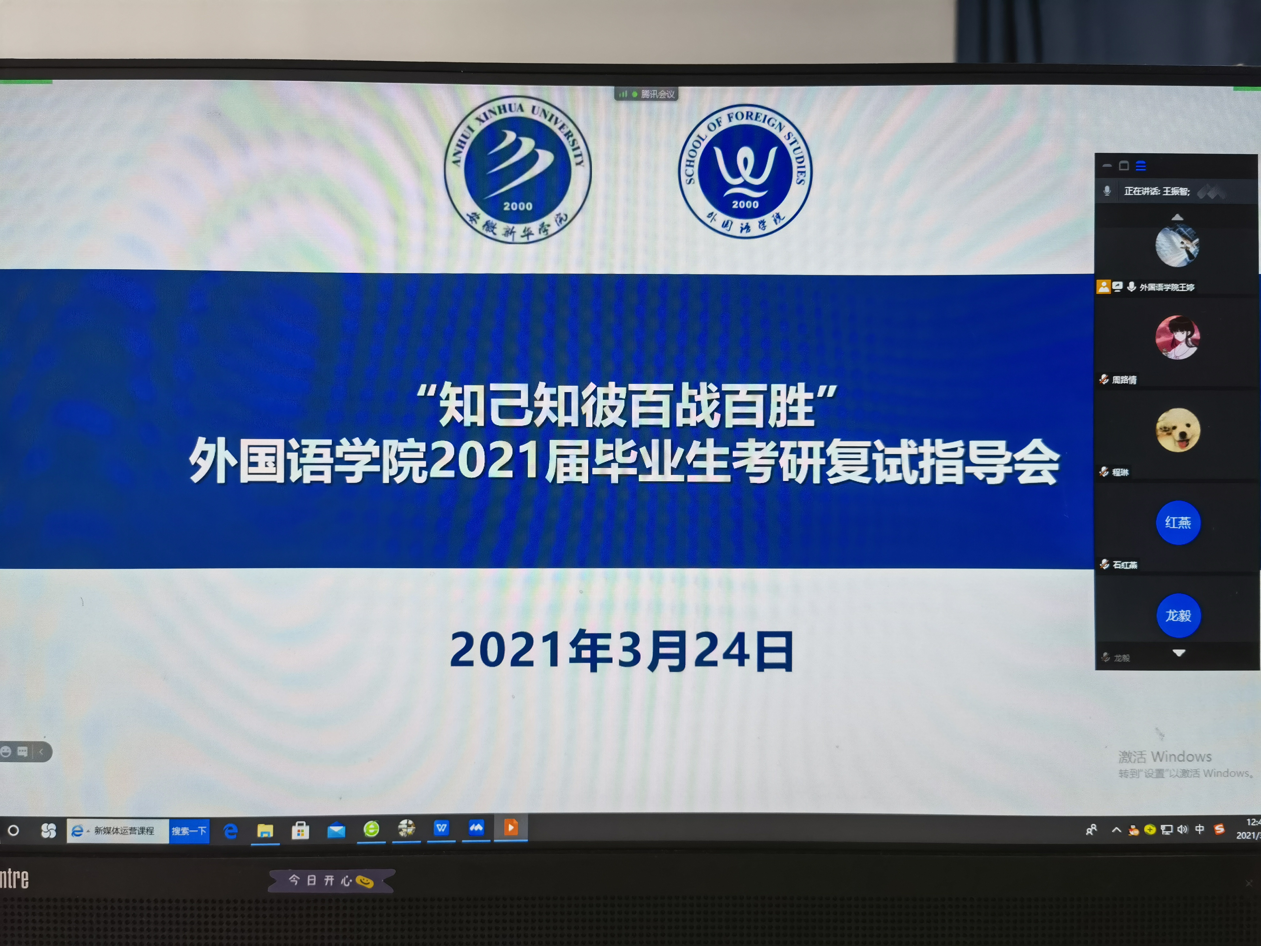本网讯(通讯员:王婷)为助力2021届毕业生实现读研梦想,3月24日中午,外国语学院通过腾讯会议的形式召开考研复试调剂经验交流会。邀请华园考研王为科院长,外国语学院院长助理陈丽、行政秘书王婷、学院专业教师及2021届考研学生20余人参加会议。会议由王婷主持。