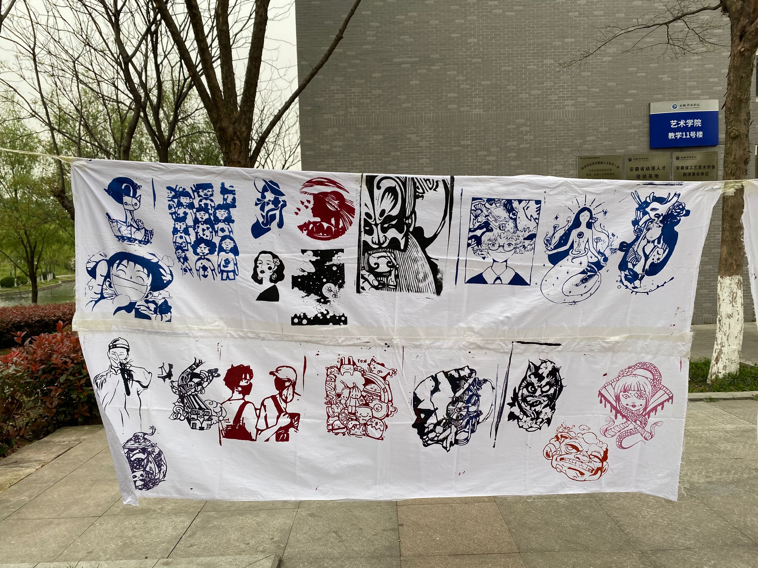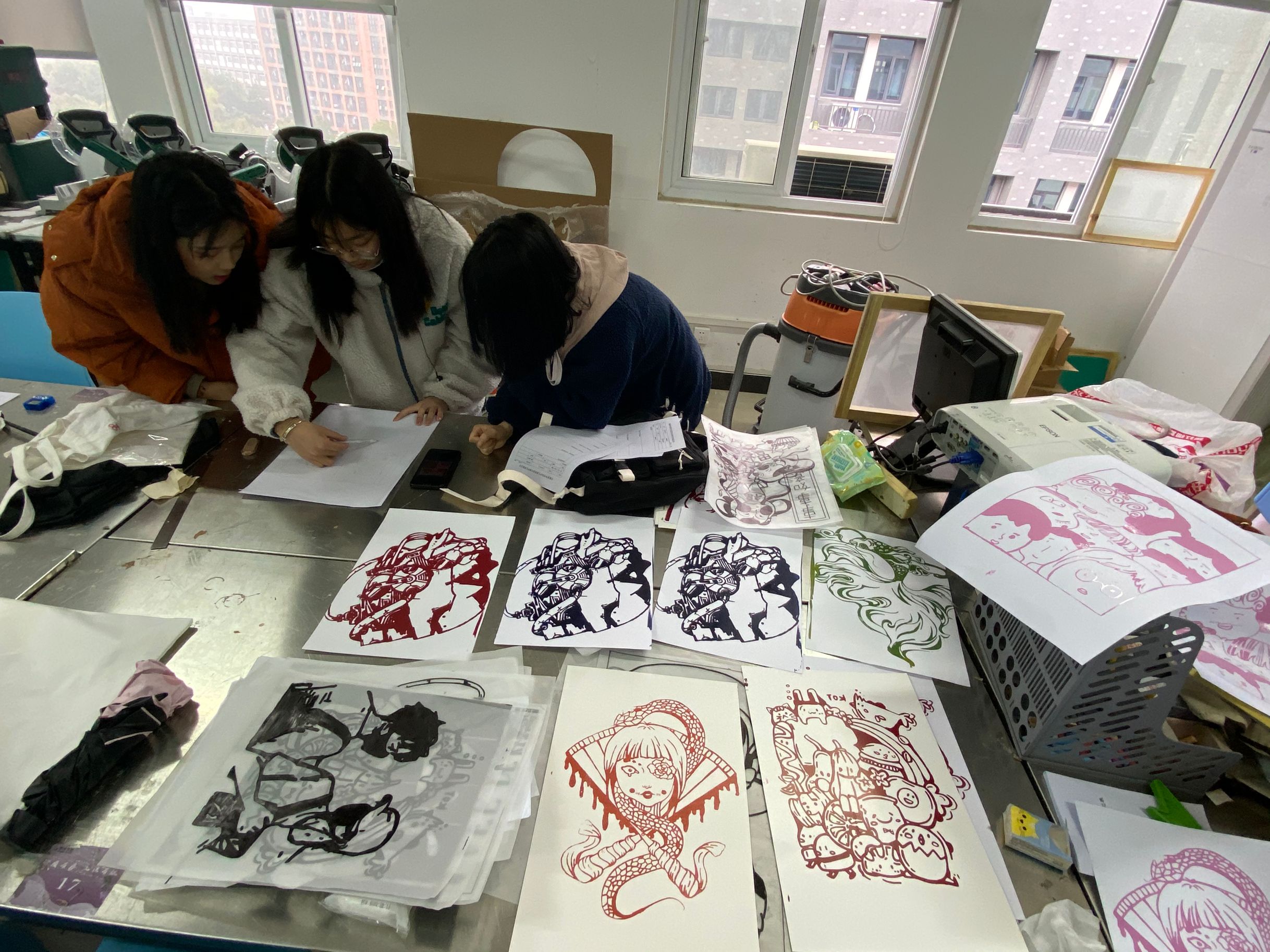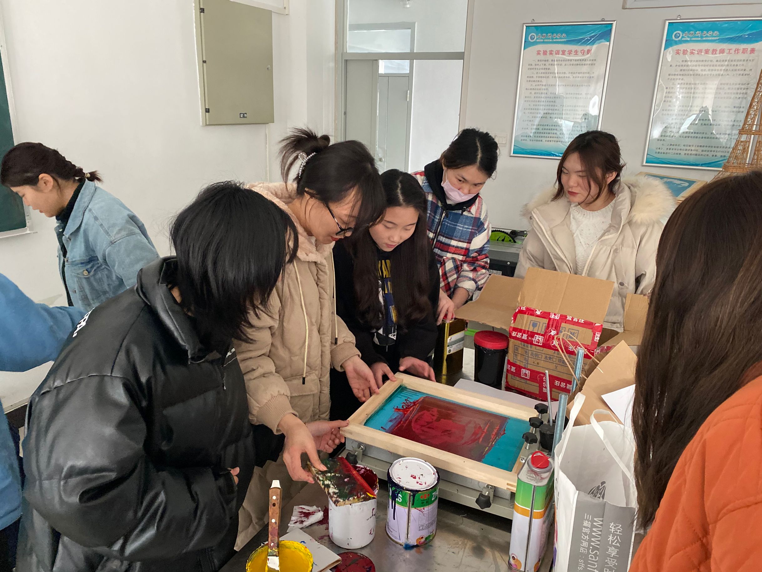 此次成果展共展出40余幅丝网印刷作品。从印框、油墨、感光胶、洗网水和脱模粉等材料的准备,到作品的完成经历了一道道工序。在印刷制作前,石岭老师带领大家学习了印刷工艺的基础知识,以及印刷的操作方法等。为了让同学们更直观的了解印刷制造工艺,带领大家前往一帆印务有限公司调研学习,充分掌握印刷工艺的相关技法。