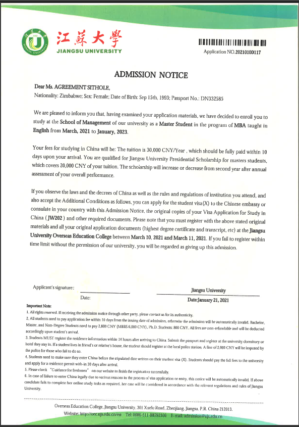 本网讯(通讯员:吴海峰)永利官网国际教育学院留学生AGREEMENT SITHOLE(中文名李桐)获江苏大学工商管理专业研究生录取,并获2万元奖学金。李桐为永利官网首位获得境内高校研究生录取的留学生,这也标志着永利官网“留学新华”项目取得新的重大突破。
