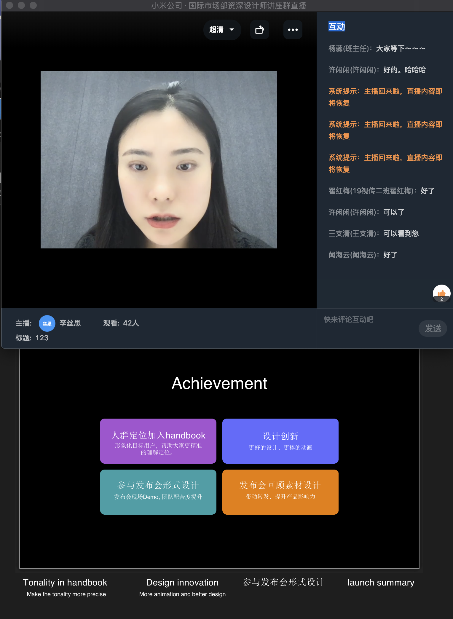 讲座中,李丝思围绕近期小米新品发布会的视觉设计进行分享,从人群定位、设计创新、发布会形式设计和发布会素材设计等角度进行细致且深入的解析。她提出,在设计的过程中不仅要注重团队协作,同时也要掌握多种设计技能以及设计统筹能力,才能够灵活应对实践过程中出现的多种问题。最后,李丝思对同学们的问题进行耐心解答,并鼓励大家在日常学习中要不断拓展眼界,加强对视觉传达设计的理解,未来才能够发挥创意于工作当中。